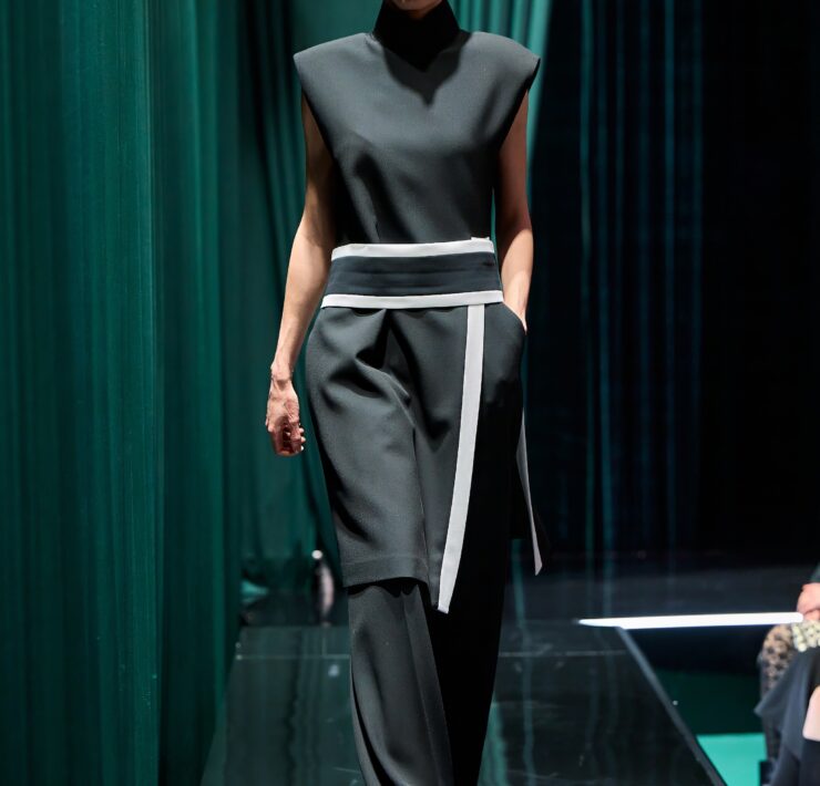 - Вечерняя линия — тот же анатомический код, но с «фейерверком» эмоций. К крою и пластике кожи добавляются мерцание кристаллов, тонкая позолота потали и декоративные цепочки. В орнаменте возникает мотив слияния двух лиц — метафора поиска и принятия собственной многослойности.